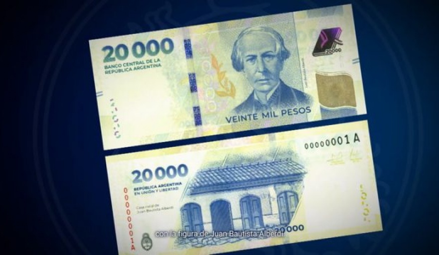 El Banco Central pondrá en circulación este jueves el billete de $20.000 a través de su red de sucursales y de cajeros automáticos de todo el país. Es el diseño con Juan Bautista Alberdi que completa la familia "Heroínas y héroes de la patria", inaugurada en 2022. Según informaron desde la entidad, la incorporación de billetes de mayor denominación permite "reducir los costos directos y los costos operativos del sistema financiero en su conjunto".