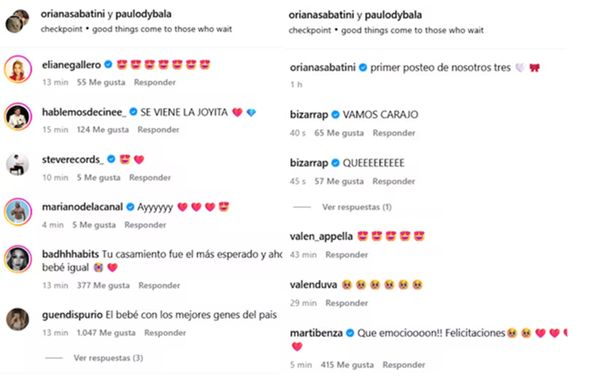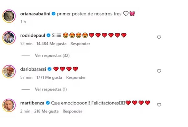 Entre otros mensajes, Giannina Maradona comentó: “Aiaaaaaaa! Qué hermosura!! Felicitaciones!!!”, y Carolina Calvagni, esposa de Tagliafico, añadió: “Los felicito!!! Los queremos!!”. El periodista Diego Leuco se sumó con emojis de corazones, mientras que la instructora de yoga Natalia Franzoni escribió: “Oriii hermosaaa que alegria!!! besos y abrazos enormes para toda la familia!”.