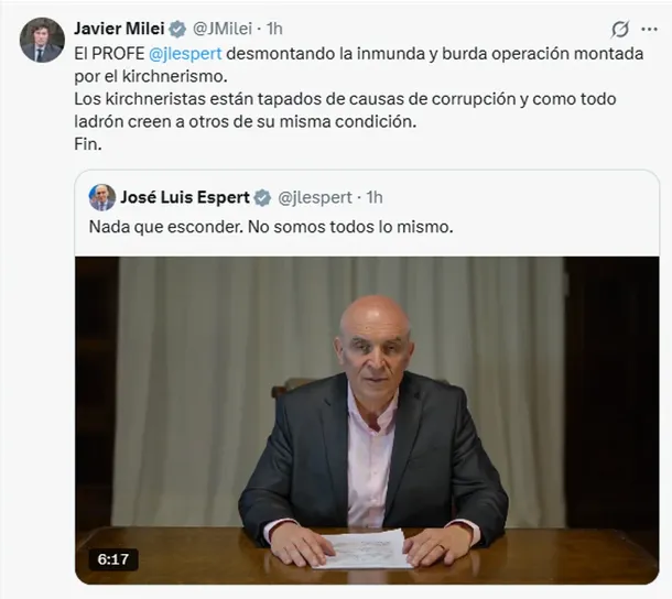 "El profe @jlespert desmontando la inmunda y burda operación montada por el kirchnerismo. Los kirchneristas están tapados de causas de corrupción y como todo ladrón creen a otros de su misma condición. Fin", publicó el presidente en sus redes y compartió el video del involucrado.