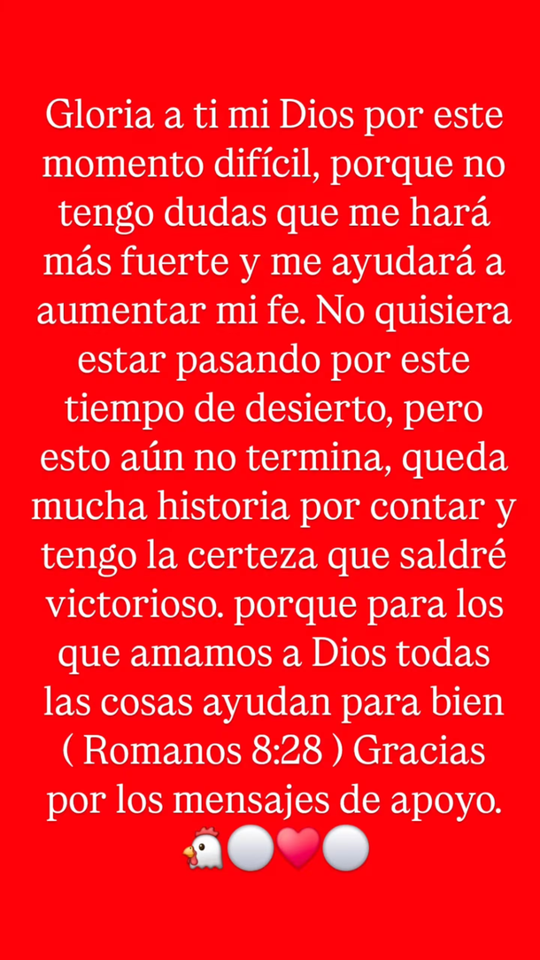 Y cerró: "Queda mucha historia por contar y tengo la certeza de que saldré victorioso. Porque para los que amamos a Dios, todas las cosas ayudan para bien (Romanos 8:28). Gracias por los mensajes de apoyo”.