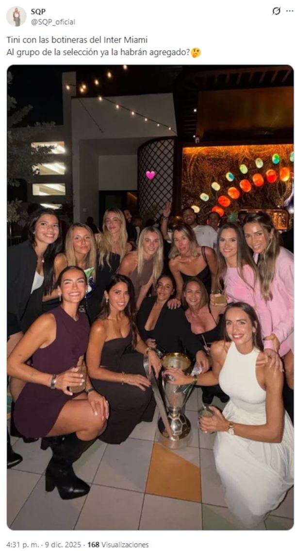 Desde las redes de SQP compartieron la foto y lanzaron una pregunta que encendió las especulaciones: “Tini con las botineras del Inter Miami. ¿Al grupo de la Selección ya la habrán agregado?”. En la imagen se la ve rodeada de Antonela Roccuzzo, Sofía Balbi, Elena Galera y Romarey Ventura, entre otras figuras del círculo íntimo de los jugadores. La buena sintonía entre la artista y las mujeres del entorno de la Scaloneta volvió a quedar a la vista.