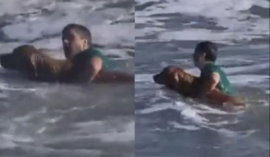 El rescate no fue sencillo. El hombre tuvo que calcular el momento justo, esquivar el golpe de las olas y acercarse al perro sin asustarlo más. Finalmente, logró alcanzarlo y sujetarlo con firmeza, en una imagen que marcó el punto de alivio de toda la secuencia. En el video se observa el instante en el que lo abraza y comienza el regreso hacia la orilla, con el animal aferrado y visiblemente exhausto.