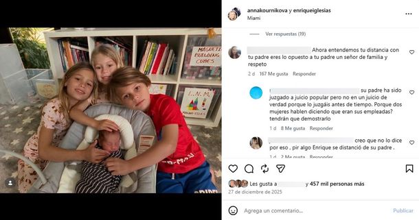 La respuesta no tardó en llegar desde otro perfil, que defendió al patriarca de los Iglesias: “Su padre ha sido juzgado a juicio popular pero no en un juicio de verdad porque lo juzgáis antes de tiempo. ¿Porque dos mujeres hablen diciendo que eran sus empleadas? Tendrán que demostrarlo”. A ese cruce se sumó una tercera usuaria, que intentó matizar la discusión: “Creo que no lo dice por eso, pero por algo Enrique se distanció de su padre”.