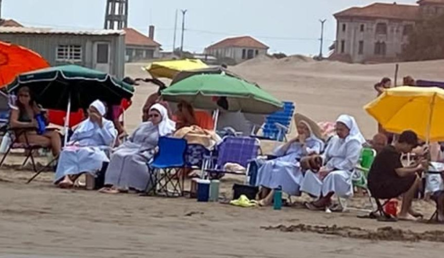 Pero entre sombrillas, reposeras y familias buscando refrescarse, una escena poco habitual llamó la atención de todos: cuatro monjas vestidas de blanco se instalaron sobre la arena y disfrutaron de la tarde frente al mar, regalando una postal tan inesperada como simpática.