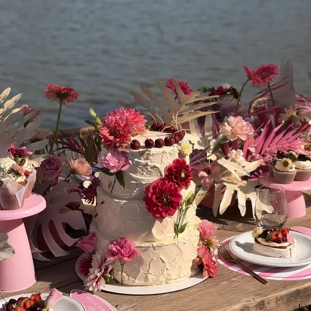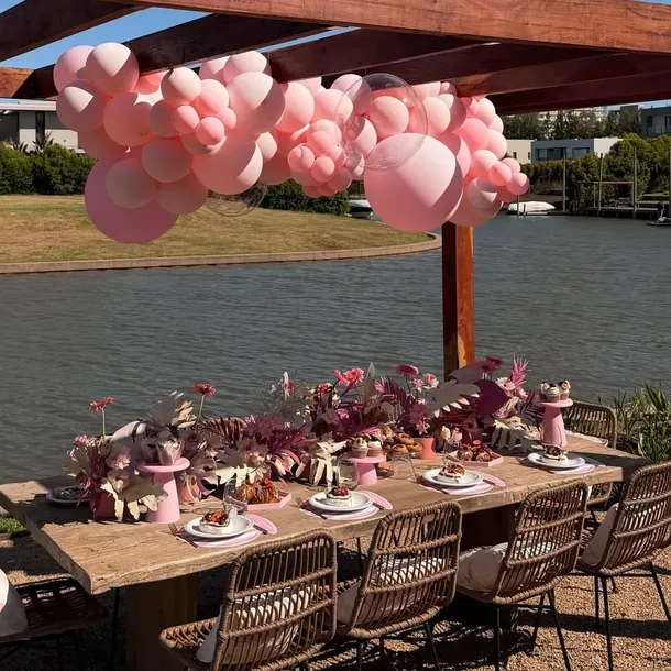 La propuesta visual de la fiesta transformó el jardín de la propiedad en un paraje costero de fantasía denominado "Fran’s Beach" (la playa de Fran). Bajo la tendencia coquette, el espacio se llenó de tonalidades rosa pastel y flores naturales que armonizaban con sombrillas rayadas y reposeras dispuestas frente al agua. Incluso se incorporó una Vespa decorativa que aportó un aire retro y sofisticado al paisaje.