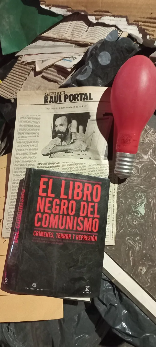 En el container también se podían ver libros, entre ellos “El libro negro del comunismo”, una publicación conocida por su fuerte postura crítica hacia los regímenes comunistas, junto a recortes periodísticos, fotografías y otros objetos difíciles de identificar. En una de las imágenes aparece además una pequeña tarjeta con la cara del conductor rodeado de monos y la frase “Para un súper ¡hop!”.