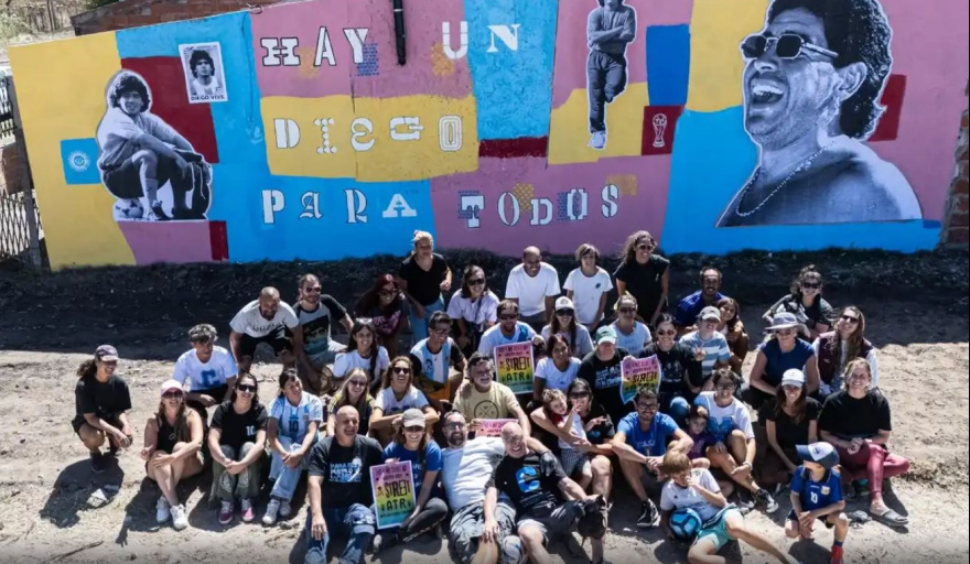 El mural, que constituye un “altar maradoniano” combinó diversas técnicas del arte urbano como pegatina, aerosol, stencil y pintura mural.