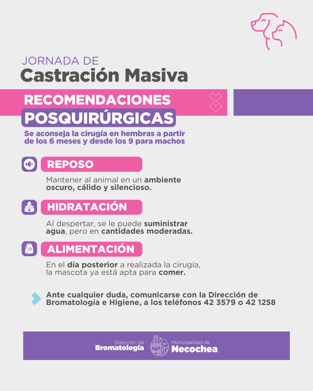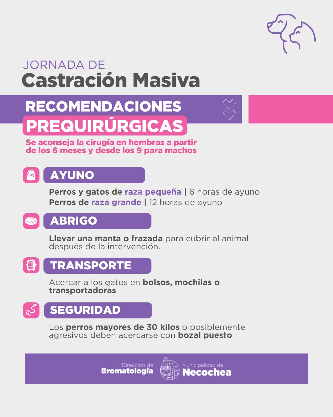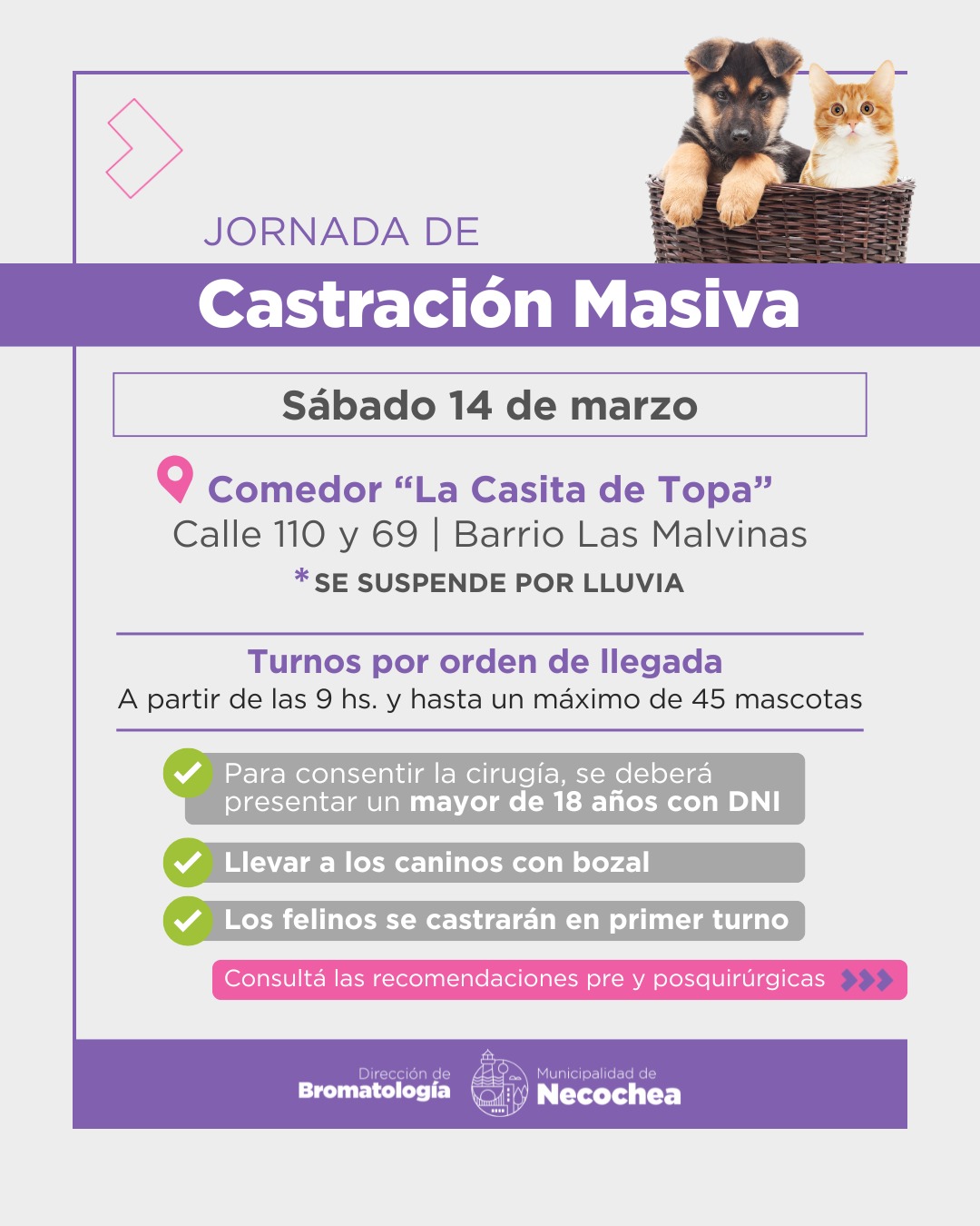 Desde el área municipal se recuerda que, para autorizar la cirugía, deberá presentarse una persona mayor de 18 años con DNI. Asimismo, los perros deberán ser llevados con bozal, mientras que los gatos serán atendidos en el primer turno de la jornada.
