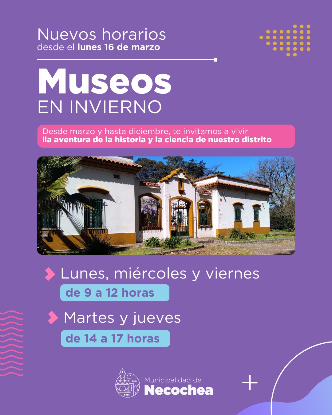 De esta manera, desde marzo y hasta diciembre, vecinos, vecinas y visitantes podrán acercarse a conocer y disfrutar de las propuestas vinculadas a la historia, la ciencia y el patrimonio natural del distrito de Necochea.