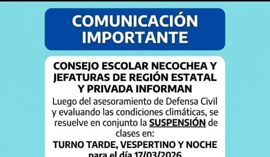 Debido al temporal que afecta a Necochea, las autoridades educativas resolvieron suspender las clases del turno tarde y vespertino durante la jornada de hoy martes.
