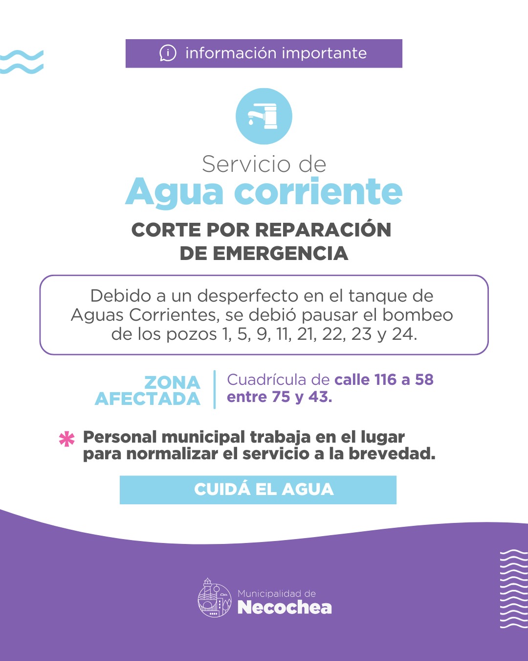 La Municipalidad de Necochea informa a la comunidad que, debido a la rotura de un caño en el pozo ubicado en 59 y 86, se verá afectado el servicio de agua corriente en un amplio sector de la ciudad.