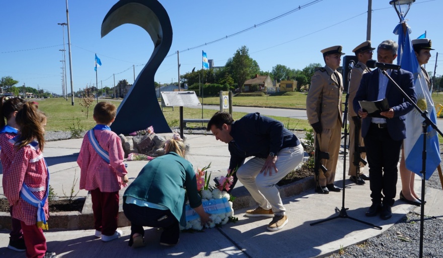 Al pie de la estructura apostada en el bulevar de Avenida Almirante Brown y 513, los mencionados estuvieron acompañados por autoridades del Concejo Deliberante y el Consejo Escolar, funcionarios del Departamento Ejecutivo e instituciones intermedias, al tiempo que las banderas de ceremonia fueron portadas por Prefectura Naval Argentina con asiento en Puerto Quequén y alumnos del nivel inicial y primario del Colegio Nuestra Señora del Rosario, entre ellos Stéfano, hijo de Fernando y Jesica.