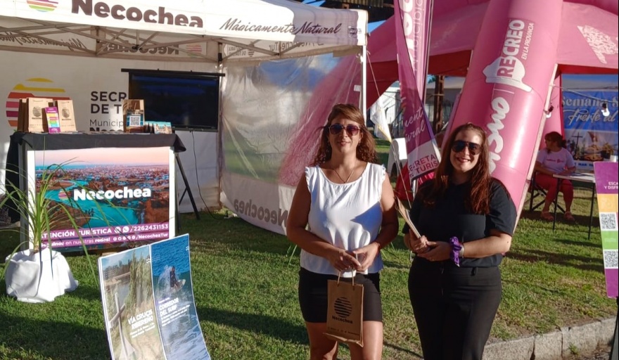 En esta oportunidad, buscando fortalecer el slogan #estamoscerca de cara a una localidad con fuerte apego a las playas locales y un gran potencial de nuevos y nuevas visitantes, las informantes de la Secretaría de Turismo y Desarrollo Productivo desembarcaron en el predio ferial para distribuir material publicitario sobre las bondades de Necochea como destino, además de proyectarse videos institucionales en las pantallas del paseo.