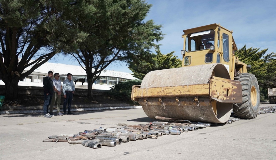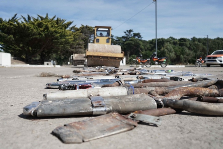 Ante la atenta mirada del intendente Arturo Rojas, quien estuvo acompañado por el Secretario de Gobierno, Jorge Martínez, la Municipalidad de Necochea procedió este lunes a la destrucción de 375 escapes de motos antirreglamentarios que habían sido secuestrados por el personal de Tránsito en los operativos en la vía pública.