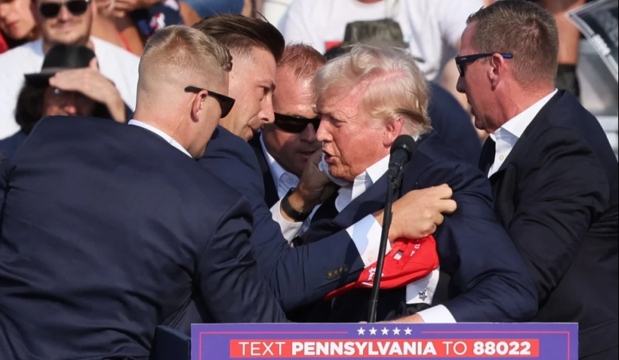 El candidato republicano Donald Trump fue evacuado del escenario durante un acto de campaña este sábado en la ciudad de Butler, en el estado de Pensilvania, al noreste de Estados Unidos, luego de escucharse múltiples disparos. Por la televisión se pudo observar al expresidente con sangre en su oreja derecha, mientras era rodeado por agentes del servicio secreto, quienes lo escoltaron fuera del escenario.