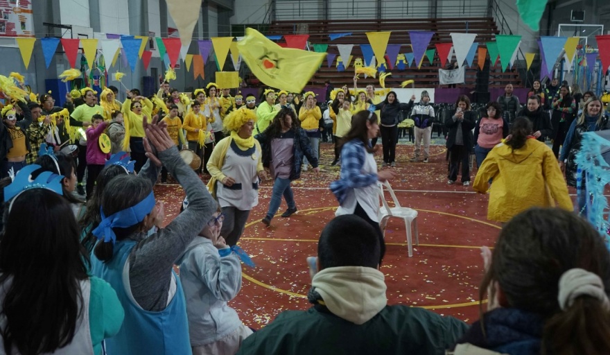 En un Polideportivo repleto de música y alegría, los integrantes de cada institución defienden el color que representa a sus compañeros y compañeras en múltiples juegos y actividades recreativas pensadas para la ocasión por el área que depende de la Secretaría de Desarrollo Humano y Políticas Sociales.
